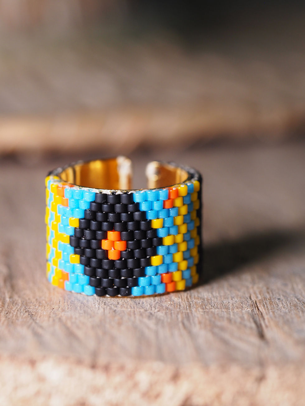 Los anillos rombos está elaborado con la técnica de tejido miyuki de puntada ladrillo y puntada peyote, lo que les confiere una belleza única y duradera. Disponibles en paletas de colores fríos, colores tierra o una combinación multicolor. Los rombos representan abundancia y prosperidad, por lo que son el complemento ideal para tu estilo diario, en combinacion con su base en bronce con baño de oro gold-filled que da un toque moderno y elegante. Sin duda tus manos serán el centro de todas las miradas.