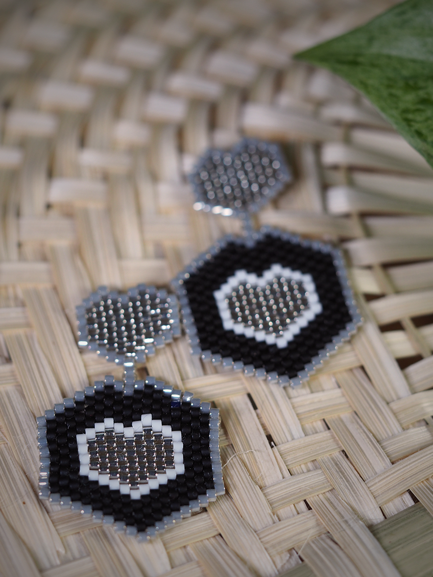 Aretes en Miyuki presenta un diseño hexagonal y corazón, con una paleta de colores fríos, una combinación de cuentas negras y plateadas galvanizadas, que lo hace ideal para cada ocasión. Su base topo en acero plateado le un acabado elegante y muy liviano.