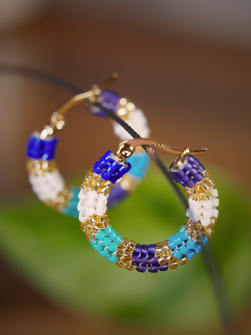 Candonga tejida en Miyuki. Un diseño sutil de colores fríos y cálidos. Técnica de tejido de puntada espiga tubular que tienen como base candongas en acero de 2 cm.