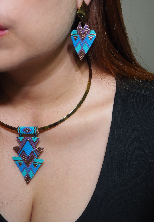 El Set Corazones de la Colección Geometrías es el complemento perfecto para cualquier ocasión, con aretes, anillo y pectoral tejidos a mano en miyuki utilizando las técnicas de ladrillo y peyote. Cada pieza está diseñada con cuidado y atención al detalle, utilizando piezas de broce bañadas en oro gold-filled para un acabado elegante y duradero. Las piezas son únicas, livianas y hechas a mano, lo que les da un carácter distintivo y artesanal.